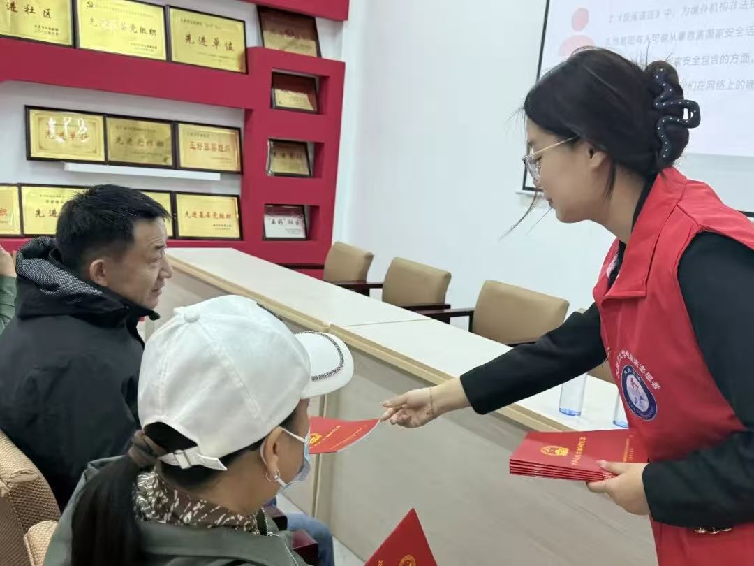 杨郁婷老师以《中华人民共和国国家安全法》等法律法规为核心,通过“案例讲解+互动答疑”的形式,向居民系统解读数据安全、个人信息保护等重点领域知识,剖析网络谣言辨别等居民高频关注的实用法律问题。针对居民提出的疑问,志愿者逐一耐心解答,结合真实司法案例拆解危害国家安全的常见行为,普及国家安全机关举报受理电话12339,引导居民树立“国家安全无小事、人人皆是守护者”的理念,同时发放《中华人民共和国民法典》《中华人民共和国宪法》等普法资料,传播法治安全知识。