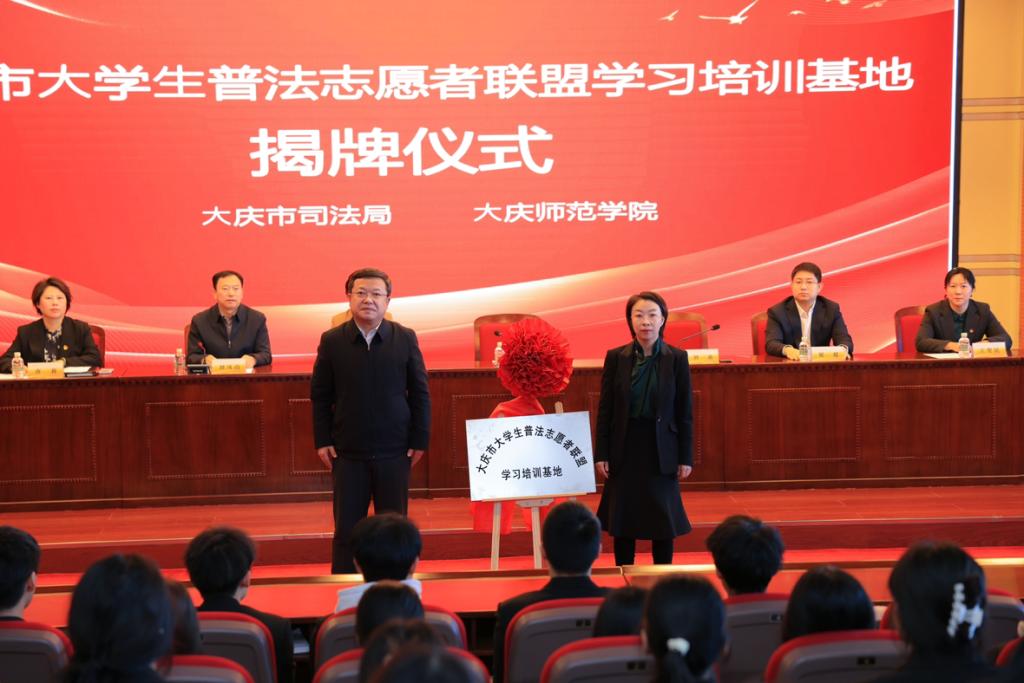 接下来,大庆市司法局党组书记局长姜世兴,伟德国际党委副书记刘迪共同为大庆市大学生普法志愿者联盟学习培训基地揭牌。