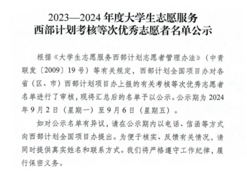 近日,全国大学生志愿服务西部计划项目管理办公室公布了《关于印发2023-2024年度大学生志愿服务西部计划考核等次优秀志愿者名单的通知》(全国项目办发〔2024〕4号)。我院毕业生裴莹莹、罗颖两名西部计划志愿者获评2023-2024年度大学生志愿服务西部计划考核等次优秀志愿者。