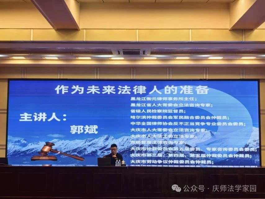 仪式结束后,大庆律师协会副会长郭斌为与会学生作了专题讲座。