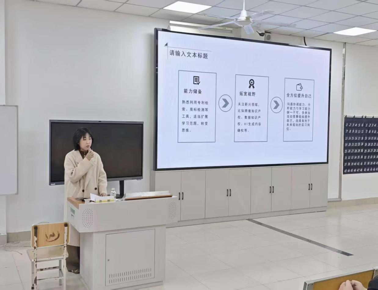 讲座紧扣2026年全国知识产权宣传周主题 “加强新兴领域知识产权保护 加快新质生产力发展”,围绕知识产权政务实务运行逻辑、知识产权赋能新质生产力与区域高质量发展路径、行业人才发展趋势、青年学子职业规划与成长建议等内容展开宣讲,系统解读了新时代知识产权保护的战略价值与行业发展前景。
