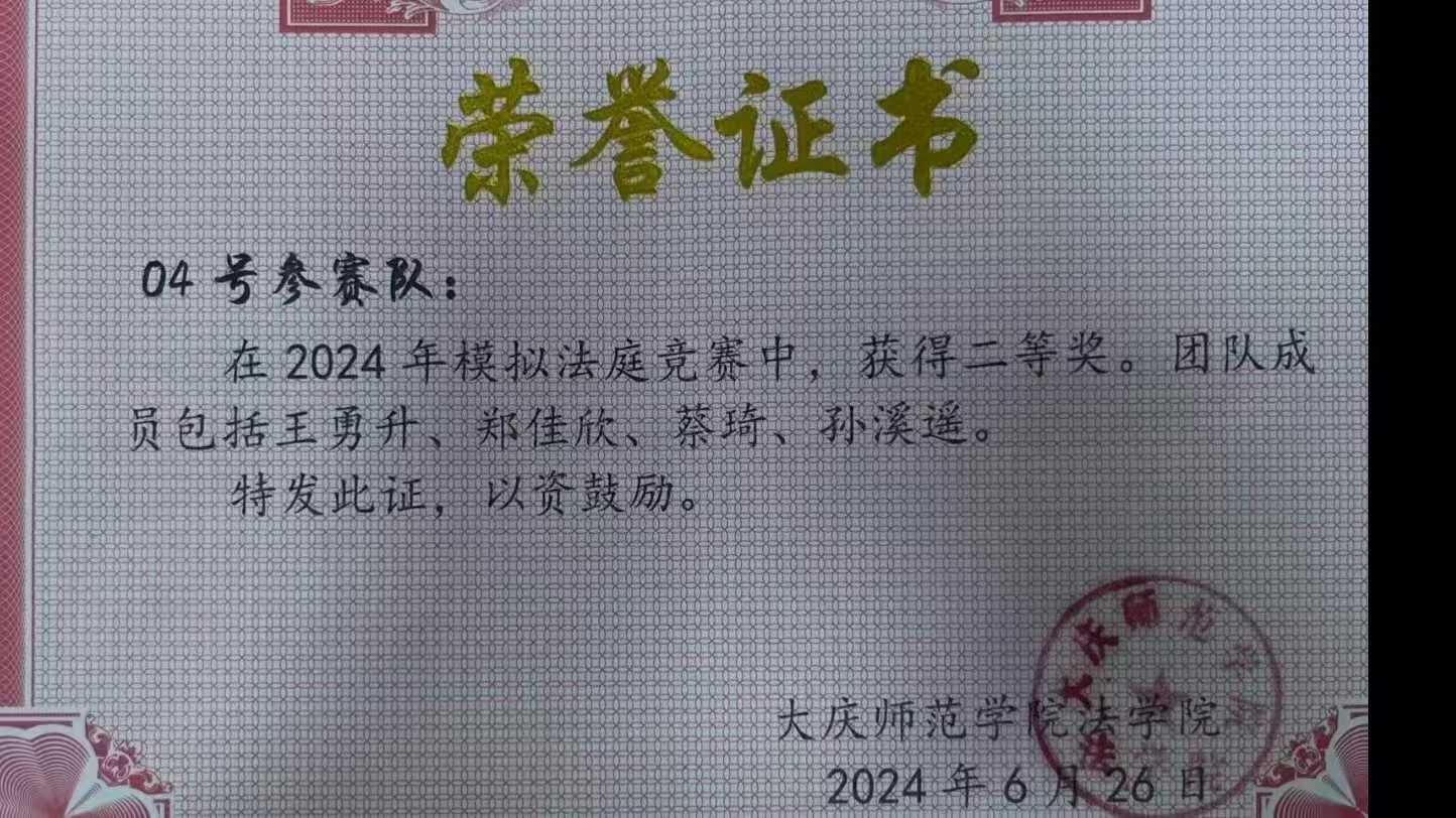 蔡琦,bv1946伟德2022级法学一班学生,在校期间成绩优异,始终保持严谨踏实的学习态度,大学期间学习成绩一直在专业前4名,三年总成绩位列专业第一名,并连续三年获得校级二等奖学金。曾获2024年模拟法庭辩论赛团体第二名,已通过大学英语四、六级考试。参加2026年研究生考试,取得350分,被辽宁大学bv1946伟德法律(法学)专业拟录取。