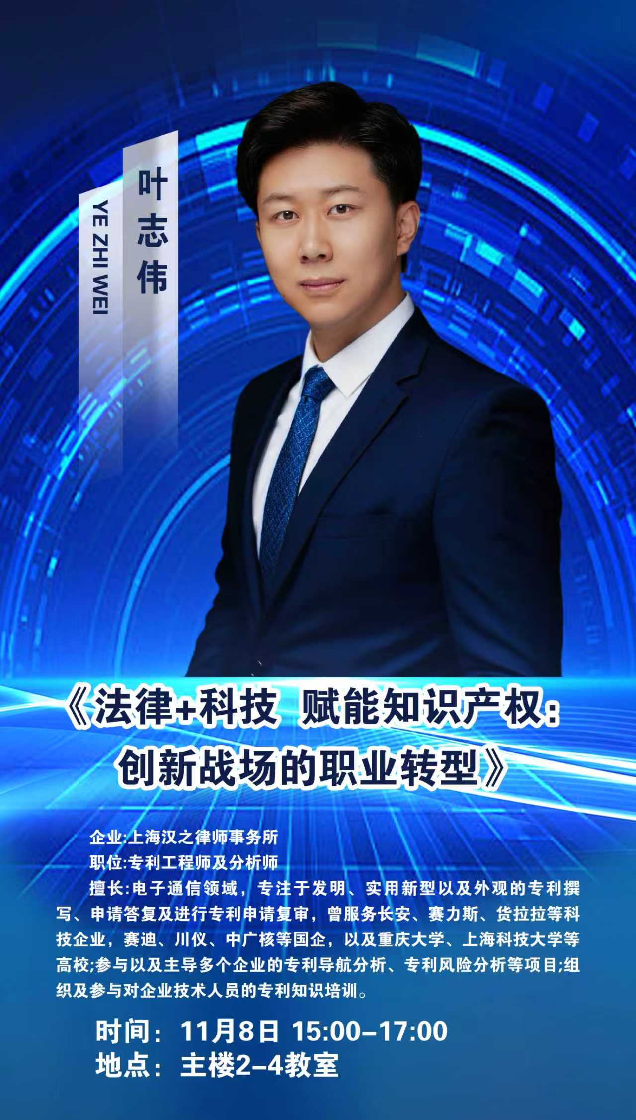 讲座通知 |《法律+科技 赋能知识产权:创新战场的职业转型》——叶志伟