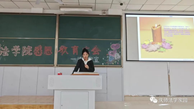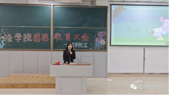 刘雨彤同学通过诗歌和小故事的形式向同学们传递感恩父母、感恩老师、感恩同学的思想。她特别强调学生要懂得感恩,是对自己、对社会、对国家的责任,要不断加强自立意识,自尊意识,培养自己健全的人格。